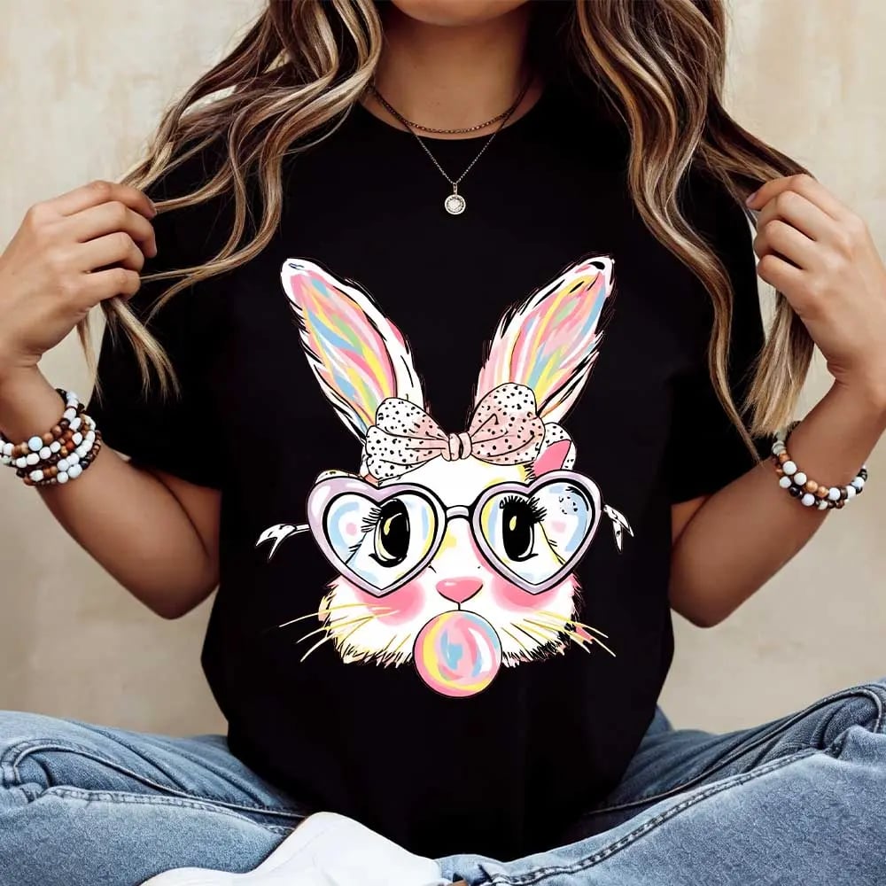 - White Colorful Easter Bunny: Features a charming Easter bunny with heart glasses and bubblegum print. Perfect for spring and holiday wear.