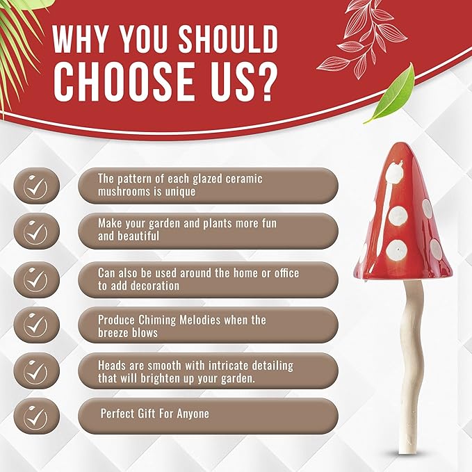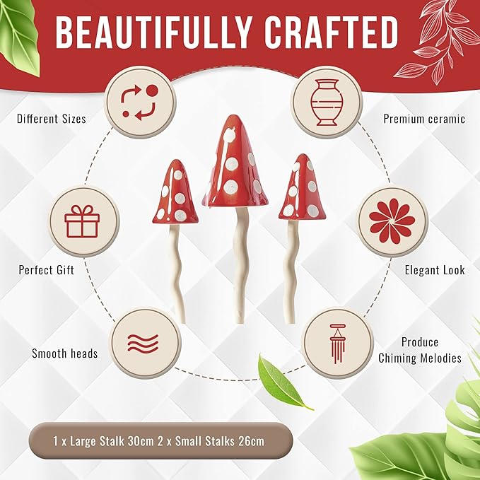 Create a serene and whimsical atmosphere with these beautifully designed ceramic toadstools. Let their unique charm and delightful sound transform your outdoor space into a tranquil retreat.